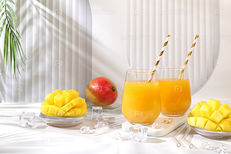 Домашний коктейль, сок или лимонад с кусочками манго и льдом на солнечном столе в кухне. Концепция летней вечеринки. Освежающий рецепт напитка для летнего диетического питания, детоксикационная диета и здоровый образ жизни