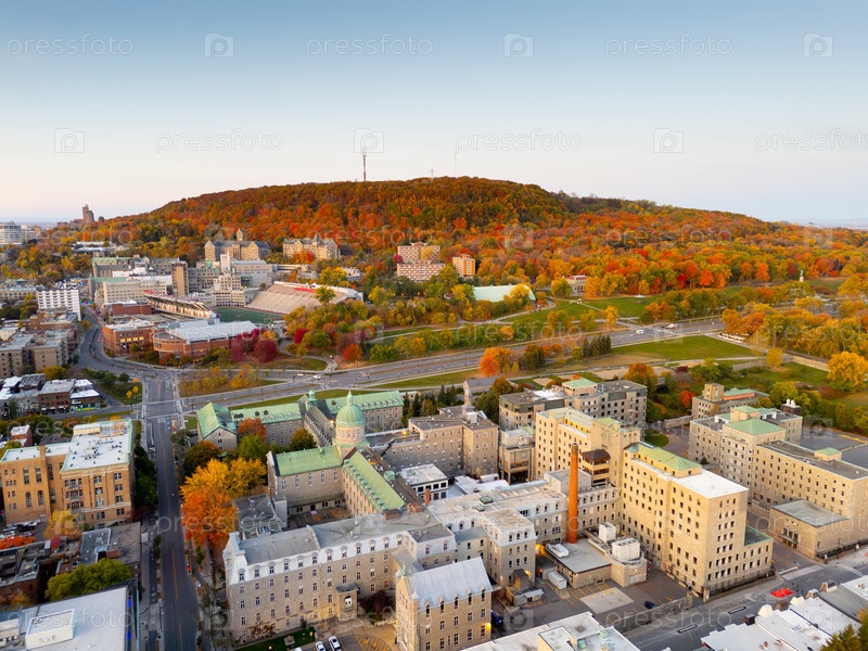 Вид из воздуха на Маунт-Рояль и город Монреаль при восходе и закате солнца с осенним лесом, зданиями города и осенними листьями. g