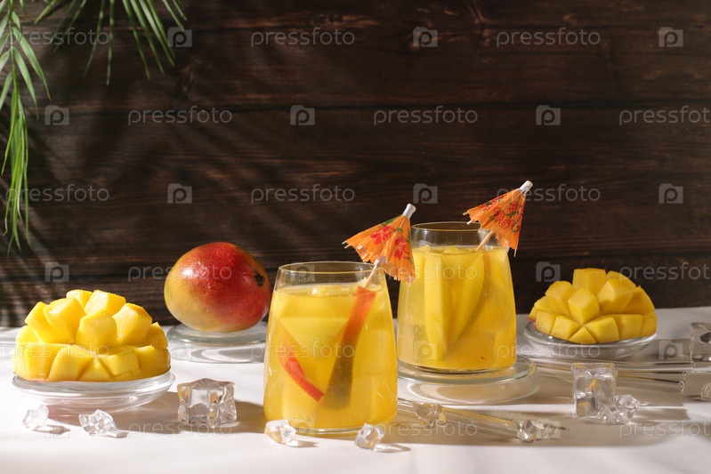 Замороженный лимонад или сок с кусочками манго, мохито с текилой, лимоном и льдом, концепция бара и вечеринки, рекламная карточка ресторана и кафе, меню ресторана, баннер для дома