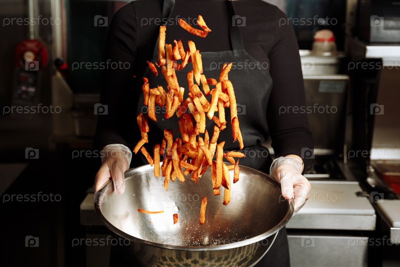 Шеф в перчатках приправляет картофель фри рядом с веганским бургером с растительным патти и рукой на деревянной доске. g