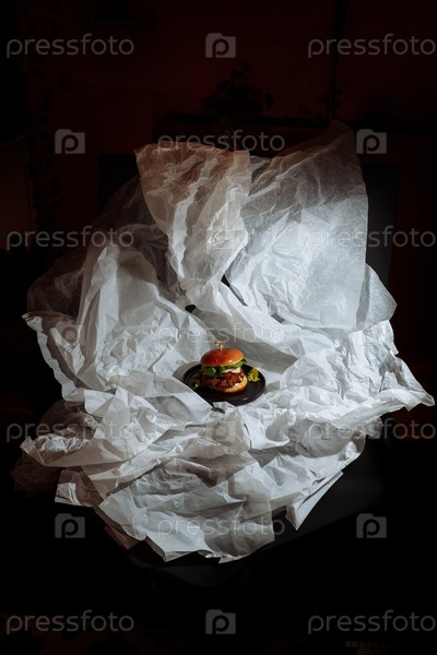 Веганский бургер с растительным патти на черной тарелке, окруженный морщинистой белой бумагой в темной студии. g