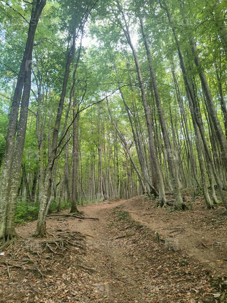 Спокойный фон лесной тропы, пешеходная дорожка с высокими деревьями обои