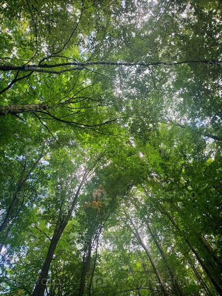 Погружающий вид лесного навеса, пышные зеленые деревья на заднем плане, обои природы