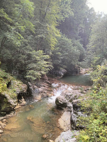 Живописная горная река в туманном лесу, дикая природа на фоне, спокойный каньон обои