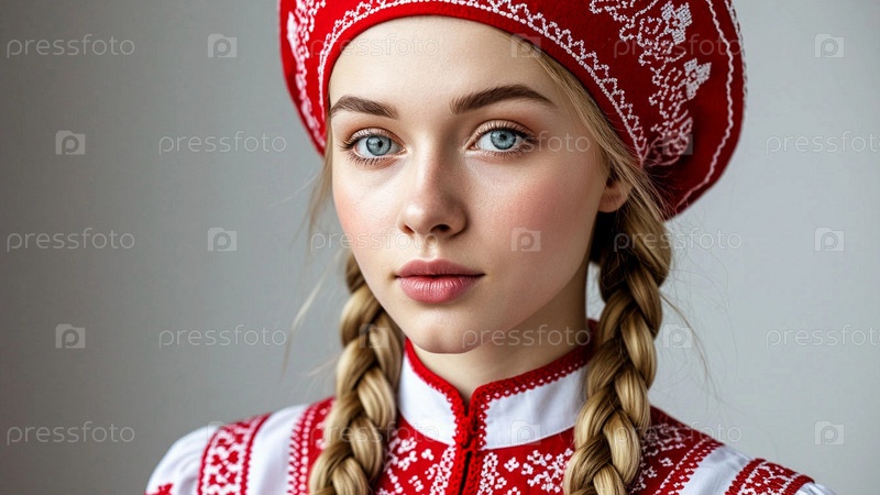 Красивая девушка в традиционном русском национальном костюме с кокошником на голове. Портрет символизирует традиции и красоту русского народа