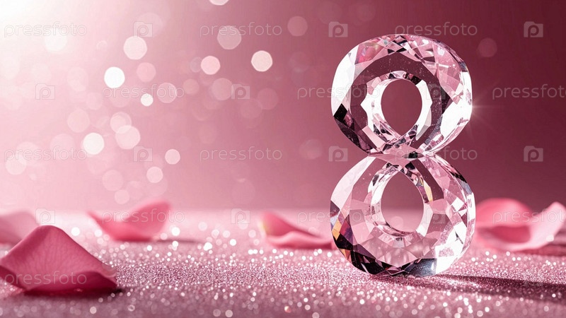 Международный женский день 8 марта. Открытка. Иллюстрация. Цифра 8 из кристалла с лепестками роз на однородном фоне. Бриллиантовая цифра 8