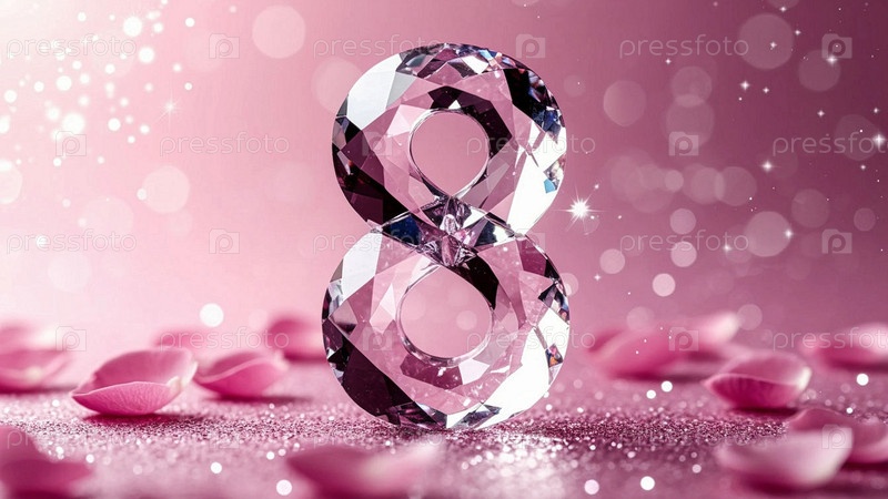 Международный женский день 8 марта. Открытка. Иллюстрация. Цифра 8 из кристалла с лепестками роз на однородном фоне. Бриллиантовая цифра 8