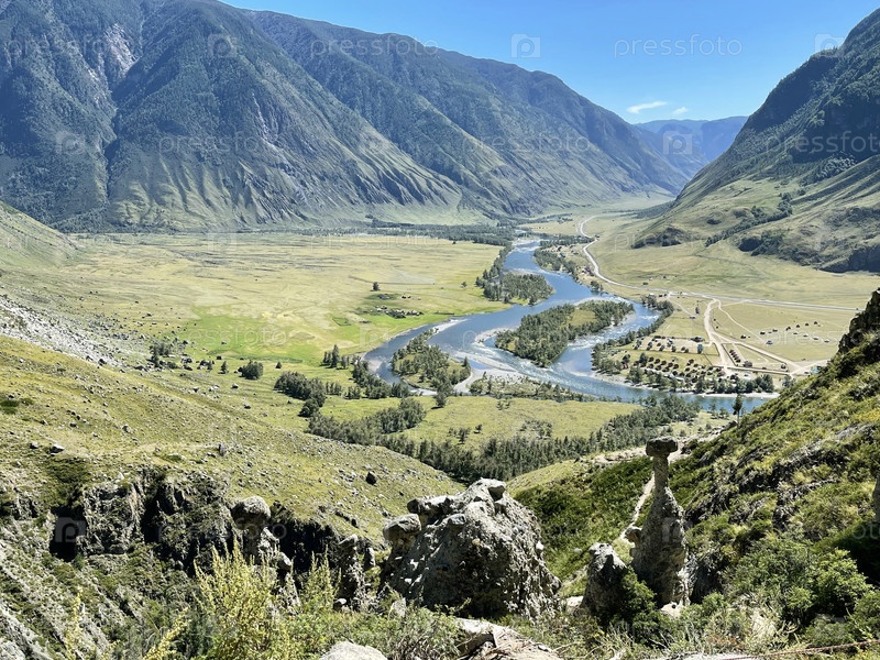 Прекрасный вид на горную долину из Stone Mushrooms, водяных лугов и реки с островами, Чулышман, Алтай, Россия