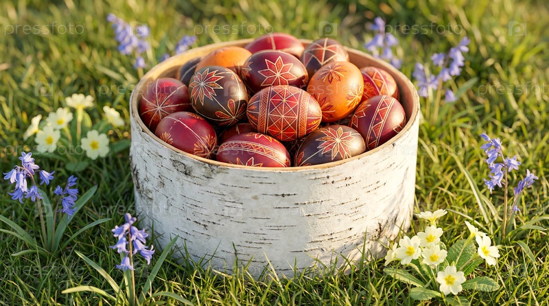 Декоративные пасхальные яйца в корзине из березовой коры на траве