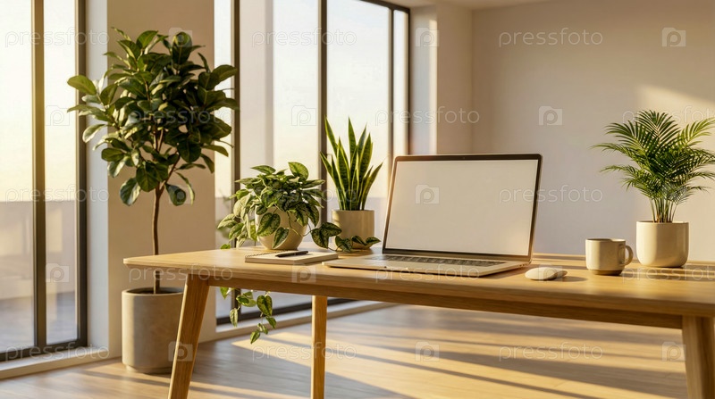 Современное рабочее пространство с ноутбуком и внутренними растениями