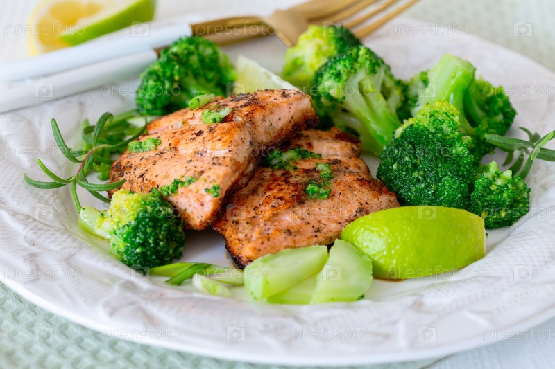 Травяной лосось и брокколи тарелка