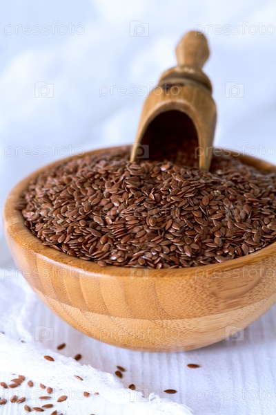 Коричневые льняные семена в деревянной миске