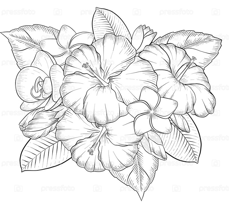 Набор иллюстраций в стиле ручной чернил тропических цветов, листьев и фруктов. для меню, косметики и упаковки продуктов питания, красочных книг и гравюрных украшений