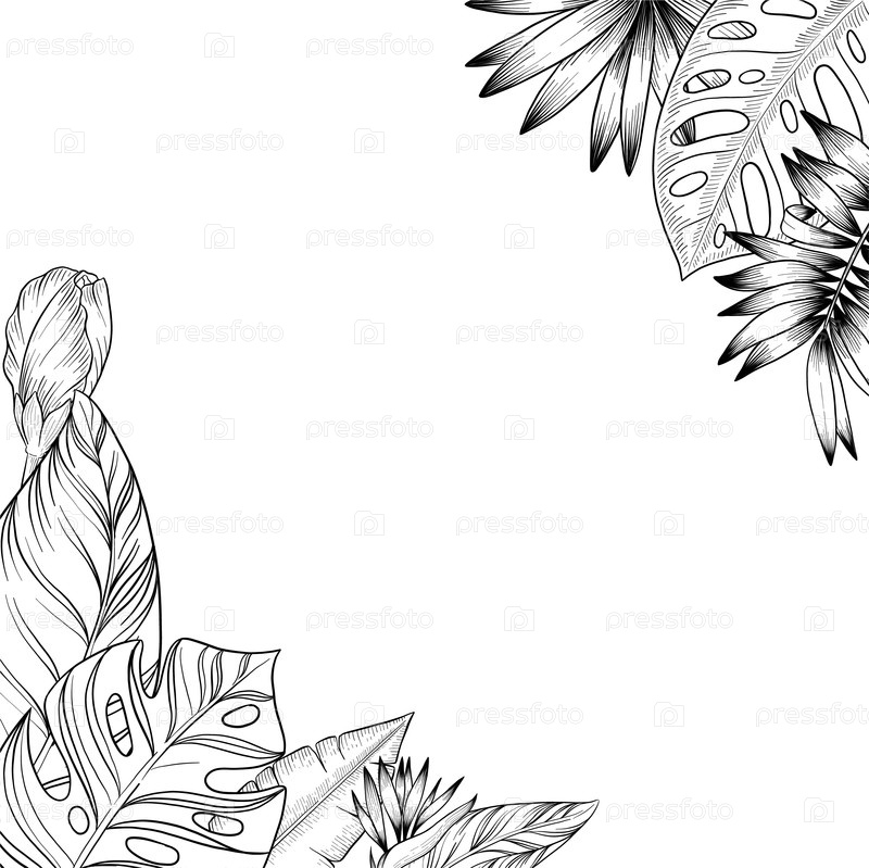Набор иллюстраций в стиле ручной чернил тропических цветов, листьев и фруктов. для меню, косметики и упаковки продуктов питания, красочных книг и гравюрных украшений
