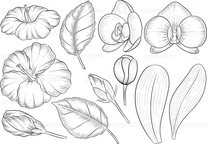Набор иллюстраций в стиле ручной чернил тропических цветов, листьев и фруктов. для меню, косметики и упаковки продуктов питания, красочных книг и гравюрных украшений