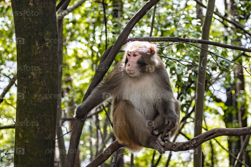 Макака на ветке дерева среди зеленой листвы