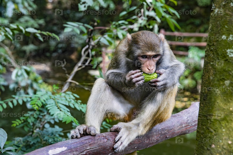 Макака ест лотос на ограждении среди зеленой листвы