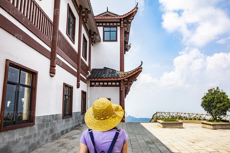 Здание в китайском стиле на скале среди зелени в горах Чжанцзяцзе, Китай