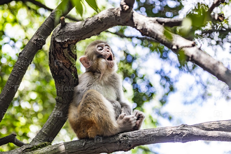 Детеныш макаки на ветке дерева среди зеленой листвы