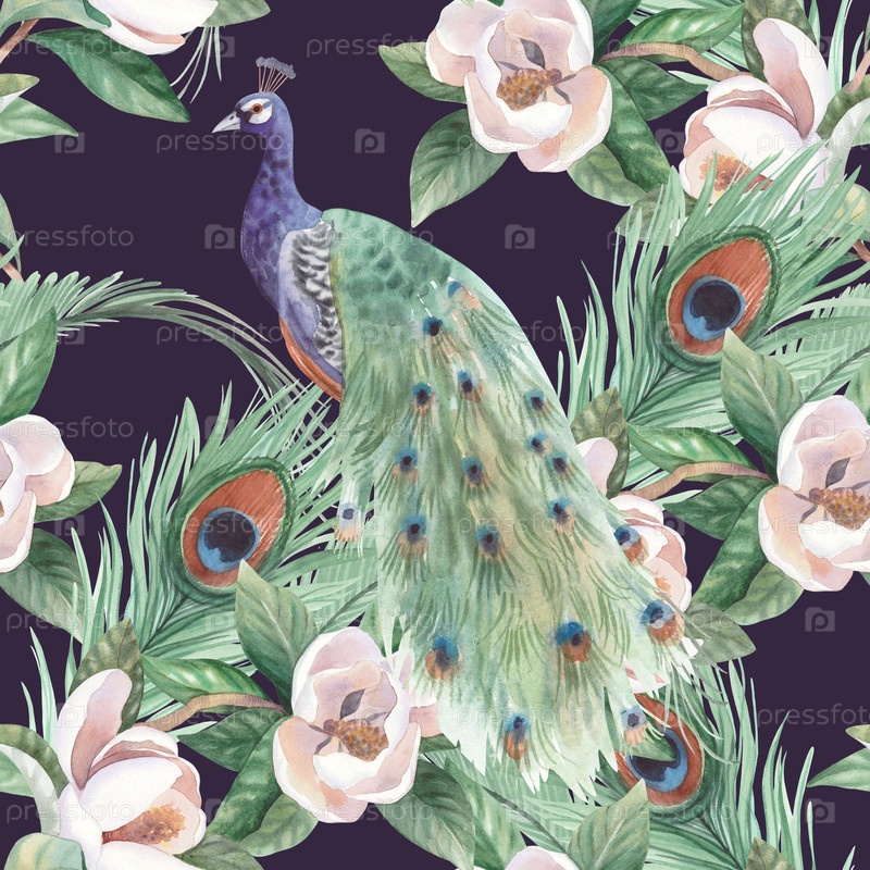 Бесшовный рисунок павлина, его перьев и магнолии на фиолетовом фоне. иллюстрация ручной акварели. для карточек, обложки, обоев, принтов, этикеток продуктов и ткани
