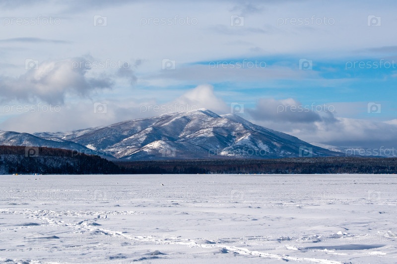 Гора возле замерзшего озера. Озеро Изменчивое, Сахалин