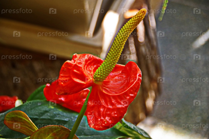 Цветок Антуриум Андре красный с сердцевидными листьями