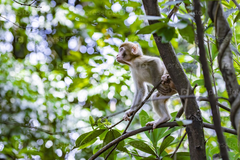Детеныш макаки на ветке дерева среди зеленой листвы