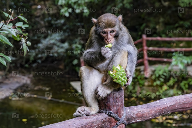Макака ест лотос на ограждении среди зеленой листвы