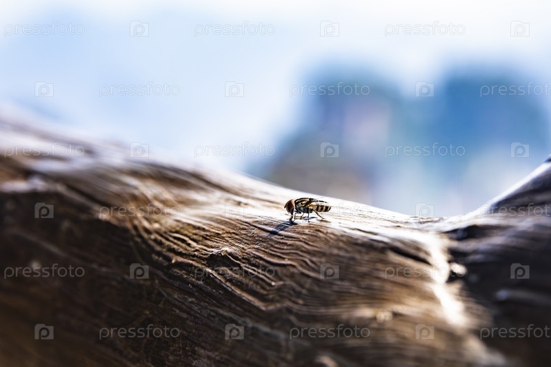 Муха-журчалка на солнечном бревне, макросъемка