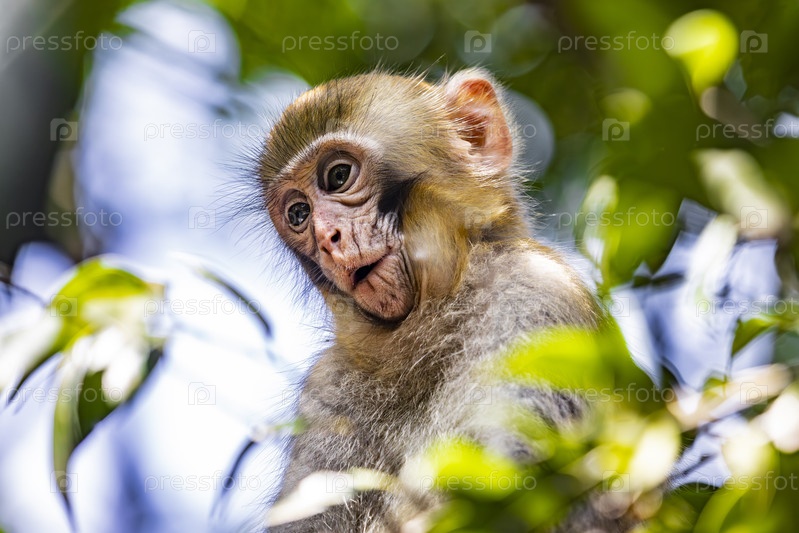 Детеныш макаки на ветке дерева среди зеленой листвы