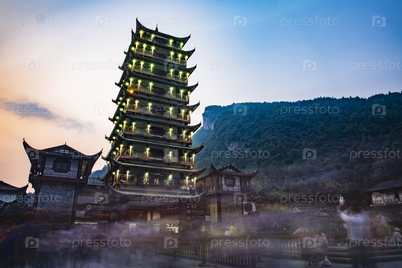 Подсвеченная китайская пагода у входа в парк Чжанцзяцзе на фоне гор в сумерках
