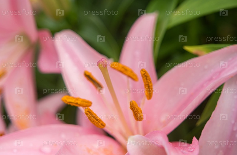 Близкий план тонкого розового бутона лилии. Цветок после дождя. Мягкая фокусировка и размытый естественный фон