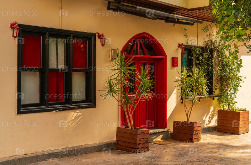 Необычная ярко-красная дверь, деревянное окно с красочными стеклянными вставками и пышные растения в горшках