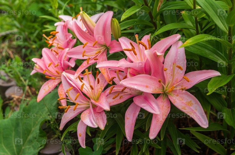 Большие розовые почки лилии с ярко-оранжевыми штаммами среди зеленых листьев.Цветы в клумбе после дождя