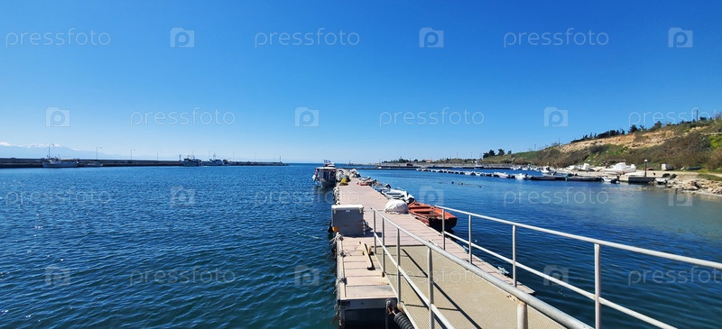 Небольшой морской порт в солнечный день. Вдалеке простирается пристань с металлическими перилами. По мосту пришвартованы небольшие лодки и моторные катера, некоторые из которых покрыты тентами, а рядом лежат рыболовные сети