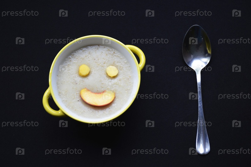 Овсянка с спелыми кусочками персиков, расположенными в виде улыбки. Вкусная и здоровая еда для детей и взрослых. Витамины из свежих фруктов и клетчатки в каше. Диетическая пища