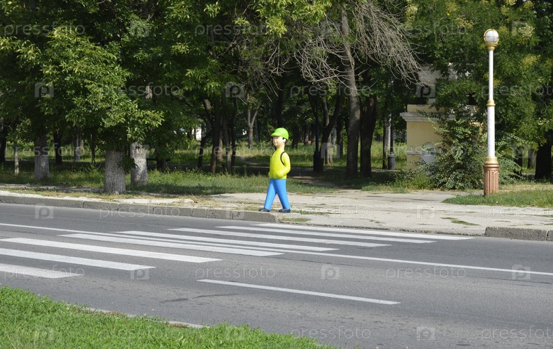 Статуэтка мальчика с рюкзаком возле пешеходного перехода. напоминание водителям о близости школы и присутствии детей на дороге. предупреждение для детей об опасностях дорожного движения