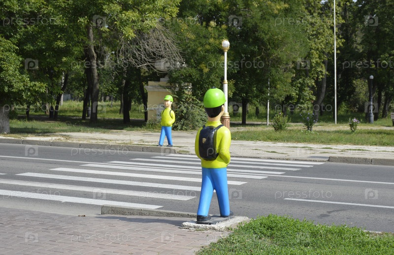 Статуэтка мальчика с рюкзаком возле пешеходного перехода. напоминание водителям о близости школы и присутствии детей на дороге. предупреждение для детей об опасностях дорожного движения