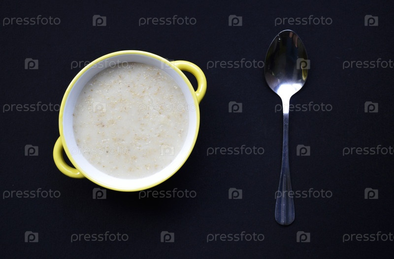 Миску с овсяной мукой, приготовленной в молоке и ложкой на черном фоне. вкусный и здоровый завтрак для детей и взрослых. правильное и диетическое питание