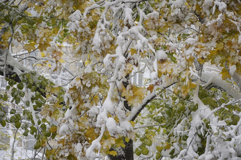 Древесные ветви с желто-зелеными осенними листьями, покрытые свежим белым снегом