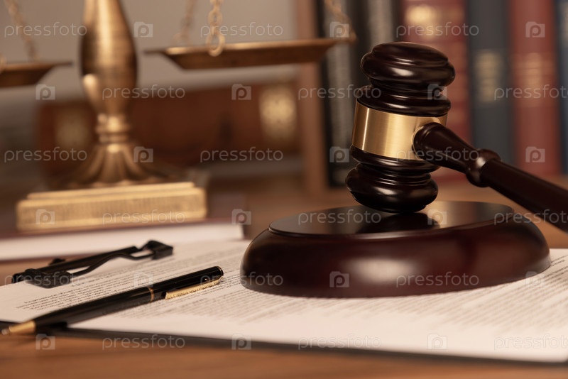 Судейский молоток, шариковая ручка и документы на столе