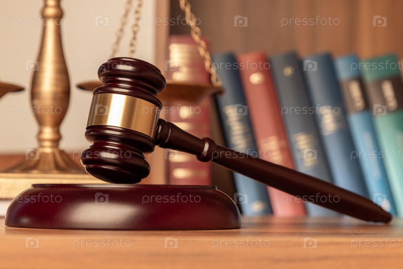 Судейский молоток на фоне книг. Мягкий размытый фон