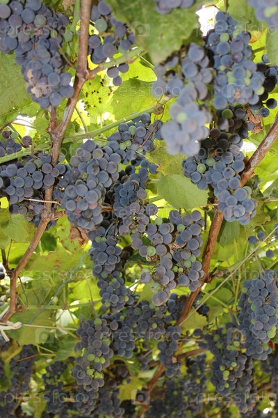Кисточки спелого винограда винного сорта на лозах беседки