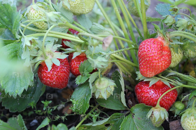 Спелые ягоды клубники на кусте в мае месяце