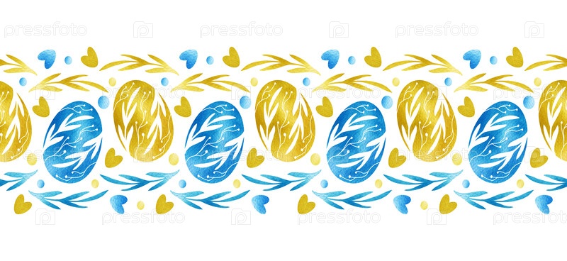 Пасхальные яйца в синем и золотом цветах с цветочным декоративным украшением. акварельная гладкая оболочка для весеннего декора