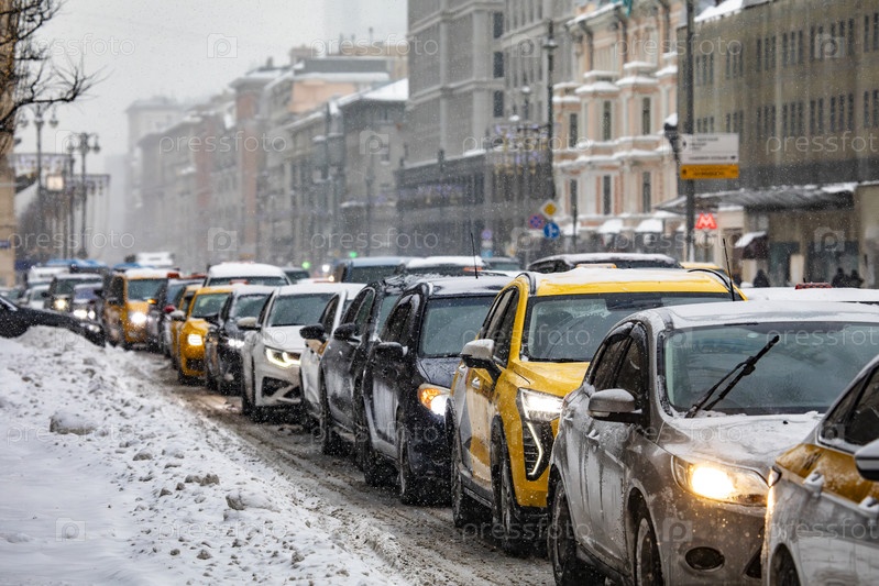 Зимняя пробка на Тверской улице с такси и автомобилями, Москва
