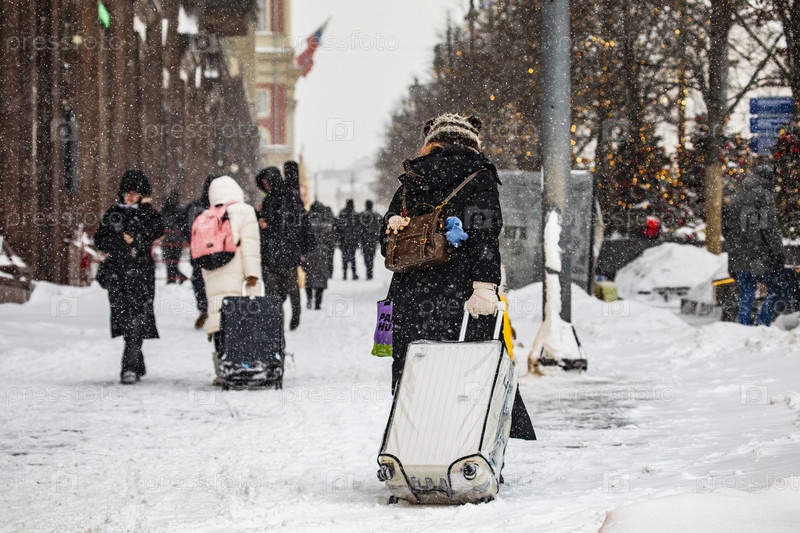 Туристы с чемоданами на заснеженной городской улице, Москва