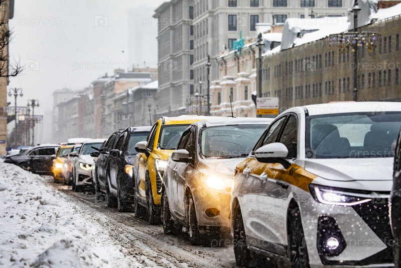 Зимняя пробка на Тверской улице с такси и автомобилями, Москва