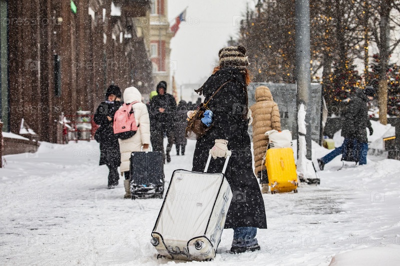 Туристы с чемоданами на заснеженной городской улице, Москва
