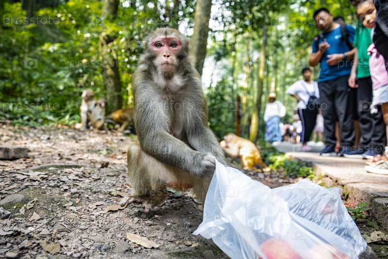 Макака у туристической тропы с пластиковым пакетом в лесу